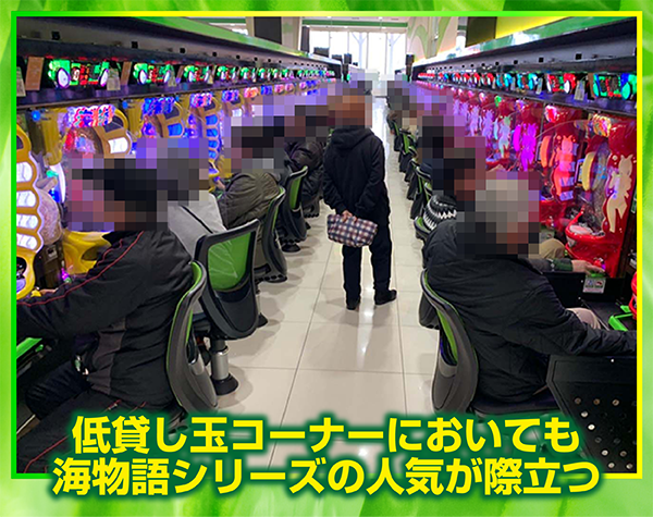 1円パチンコの「CRAスーパー海物語IN沖縄4withアイマリン」や「CR大海物語4 Withアグネス・ラム 遊デジ119ver.」のにぎわいも大きい。どちらもほぼ満席となっており、大きな盛り上がりに包まれていた。