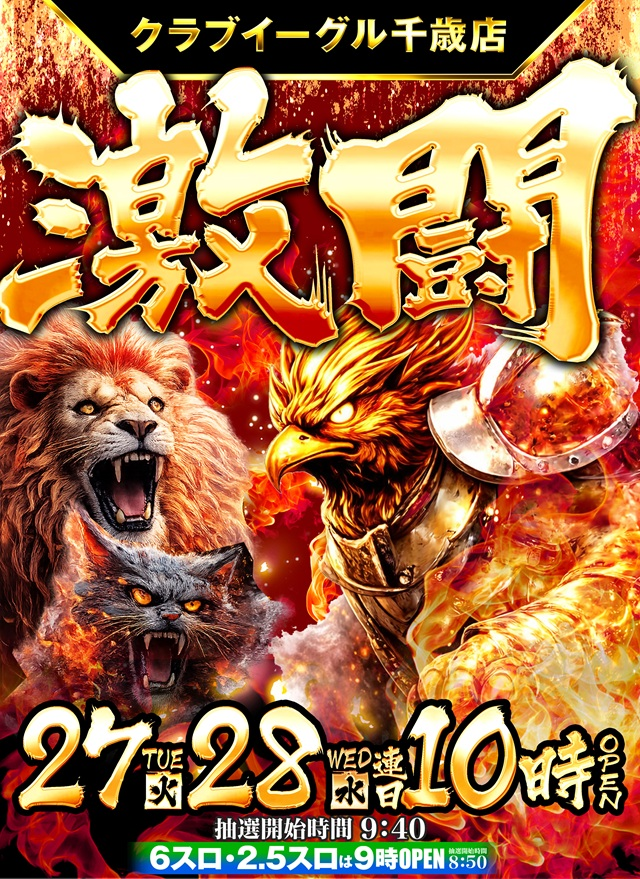 ≪激闘≫1/27(火) 20スロ10時開店!!抽選9時40分