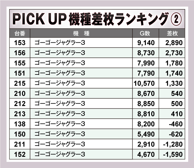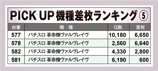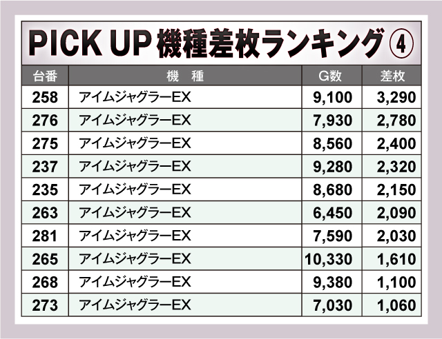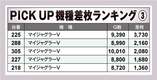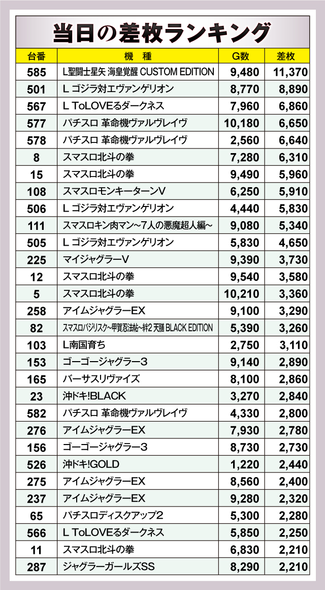 まずは差枚ランキングのチェックから。30台すべてが+2,000枚オーバーで、+3,000枚オーバーは17台出現。それらのなかでもっとも優秀だったのは、585番台の「L聖闘士星矢 海皇覚醒 CUSTOM EDITION」で、差枚は大台突破の+11,370枚を獲得! その他ランクイン機種を見渡すと、スマスロが大半を占めるなか「アイムジャグラーEX」などのノーマルタイプも複数台ランクイン! 多種多様な機種にチャンスが隠されていたようだ!