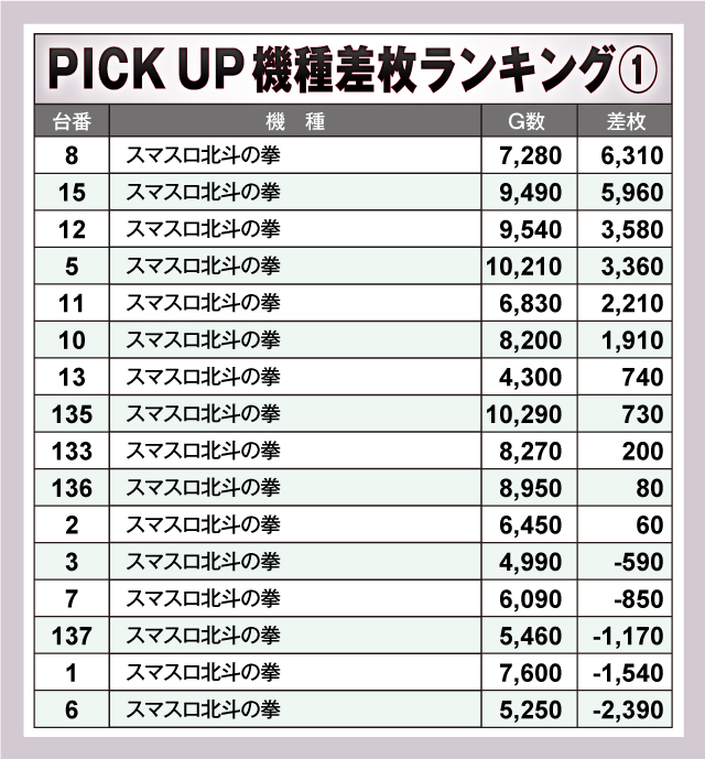 続いては、当日とくに盛り上がっていた6機種を紹介。6機種すべてがトータルプラス終了!それらのなかでも、「スマスロ北斗の拳」は全16台のうち11台が。 また「ゴーゴージャグラー3」も8台/12台がプラスで、こちらも申し分のない記録を残していた。これらの機種たちが当日の盛り上がりを牽引していたのは間違いなさそうだ!