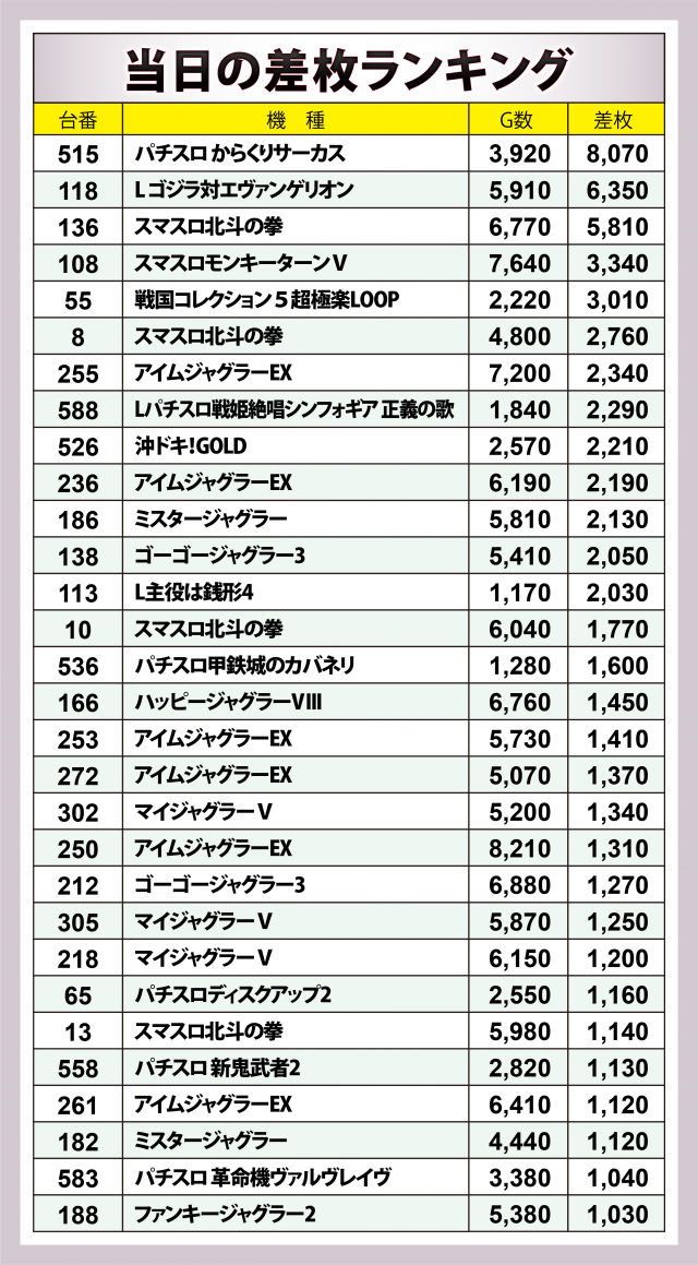 この日の[1000円/46枚]スロコーナーは時間差開放と限られた枠での営業となった。トップ30台の成績をチェックすると、30台の全てが+1,000枚overを成し遂げ、+2,000枚以上は13台、+3,000枚オーバーは5台、+5,000枚オーバーは3台、+6,000枚オーバーは1台、+8,000枚オーバーは1台となった。
