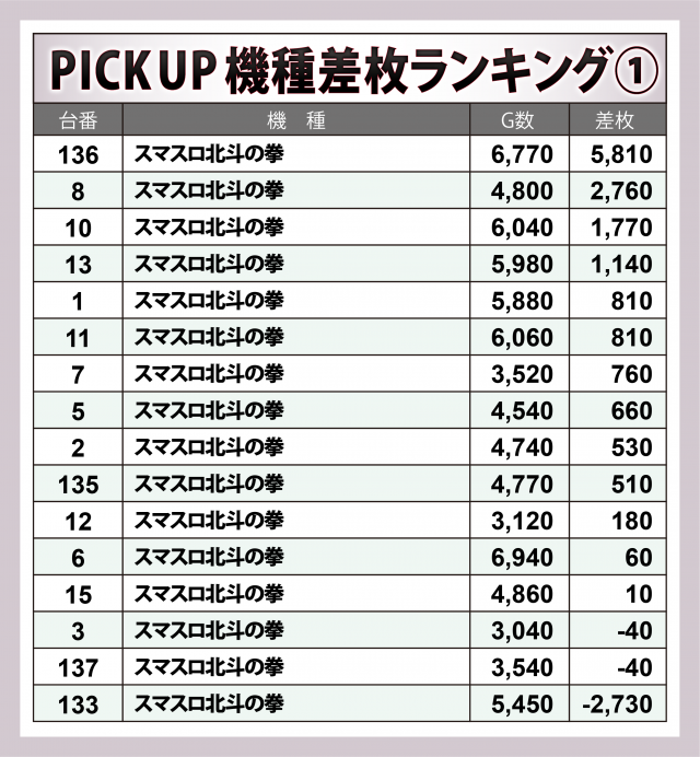 『スマスロ北斗の拳』16台では136番台が+5,800枚超とシマの頂点に到った他、プラス台は2桁に上り、その多さが目立った。