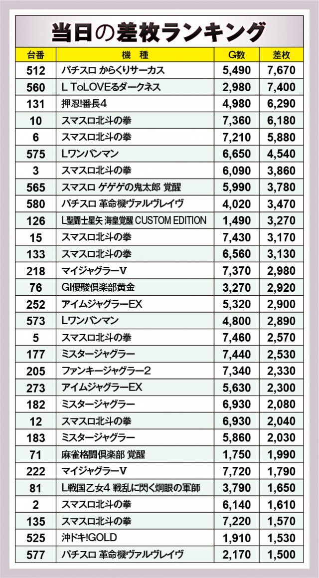 『パチスロ からくりサーカス』『L ToLOVEるダークネス』から7,000枚OVERが発生しており、同機種が盛り上がりを牽引する存在となっていた。また『スマスロ北斗の拳』は多く名を連ねており、回転数も大きいことから、相当な手応えを感じていたのは間違いない。『ジャグラー』シリーズもコンスタントに大当りを披露し、老若男女問わず充実のひと時を過ごせたことだろう。