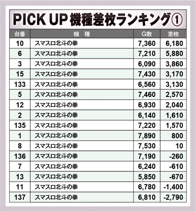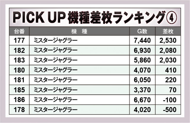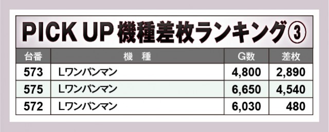 『スマスロ北斗の拳』は設置台数が多いながらも、どの台もじっくりと打ち込まれていたのが顕著だ。その中でしっかりとATを継続させては、まとまった出玉を獲得していたのが何よりも鮮烈である。また『Lワンパンマン』は全台プラス差枚数を達成しており、ファンも好感触を得ていたことだろう。『ミスタージャグラー』も2,000枚OVERが3台と、GOGOランプが煌びやかに輝いていたようだ。