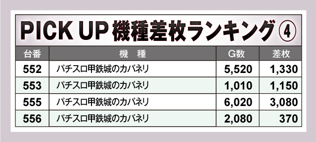 続いては、当日店内を大いに盛り上げた4機種をチェック。4機種すべてから良台が多数出現していたが、注目して欲しいのはやはり「スマスロ北斗の拳」の盛り上がり。ピックアップ16台のうち14台がプラス終了しており、差枚+1,000枚超えは12台で、差枚+4,000枚超えはなんと5台出現と素晴らしい結果をマーク! また、もちろんその他の機種にも好記録がアチコチで出現していた!