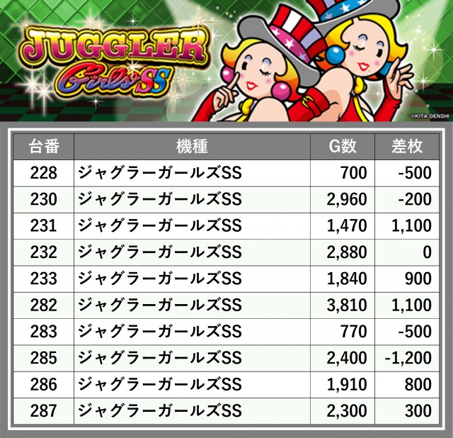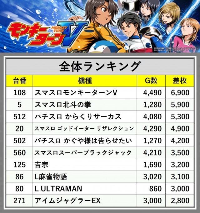 厳選された取材対象機種をはじめ、その他スロット全体から好記録が飛び出した!プレイヤーが楽しんだ1日を下記データにて振り返ってみて欲しい。