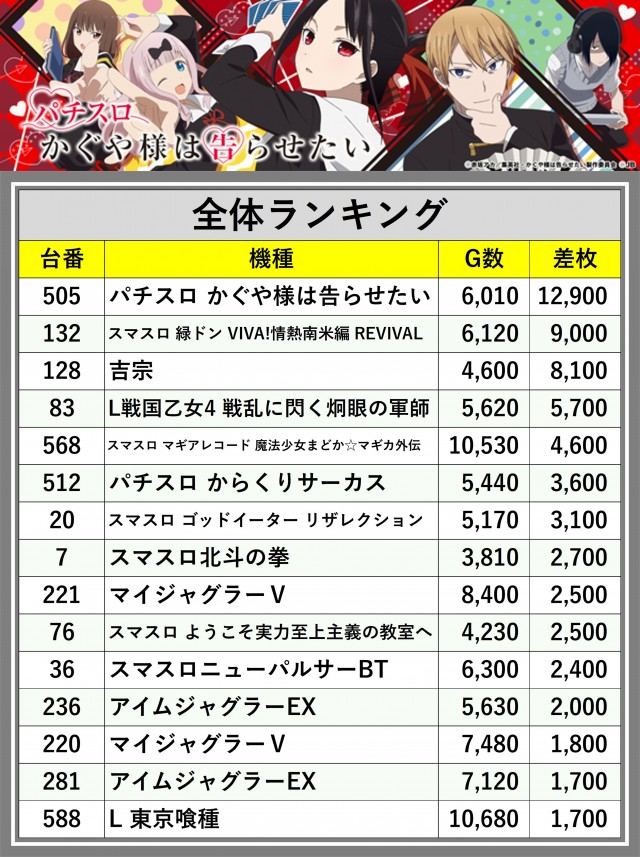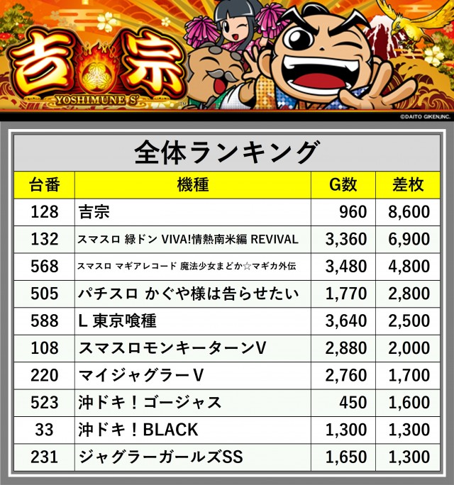 厳選された取材対象機種をはじめ、その他スロット全体から好記録が飛び出した!プレイヤーが楽しんだ1日を下記データにて振り返ってみて欲しい。