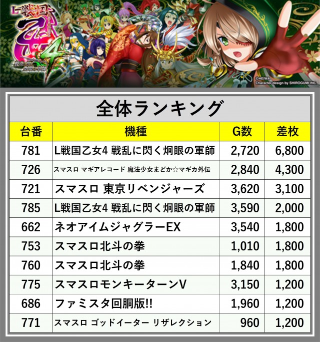 ※差枚数順に掲載しています