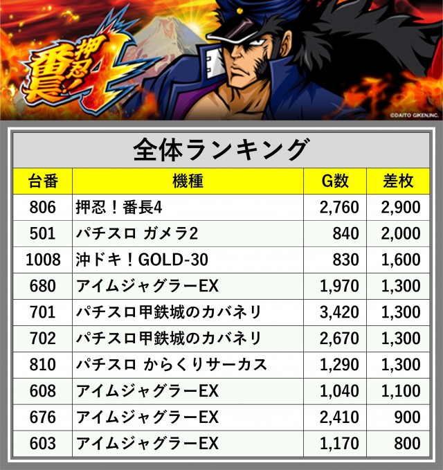 厳選された取材対象機種をはじめ、その他スロット全体から好記録が飛び出した!プレイヤーが楽しんだ1日を下記データにて振り返ってみて欲しい。