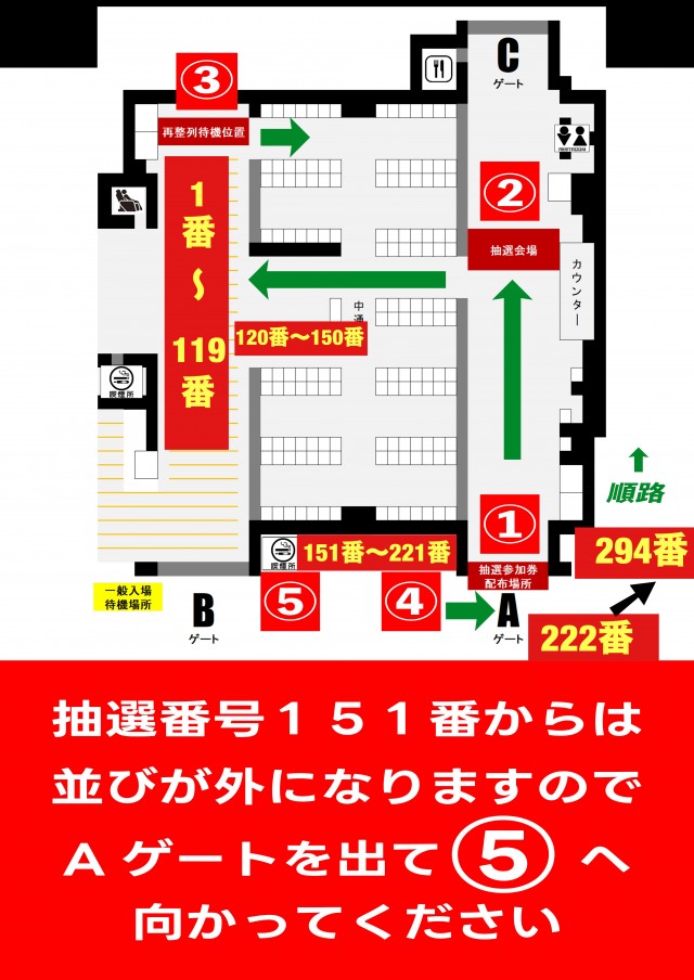| ルール詳細 | 土日祝日等、混雑が予想される時は30分前から抽選参加券配布→抽選入場、となります。 |