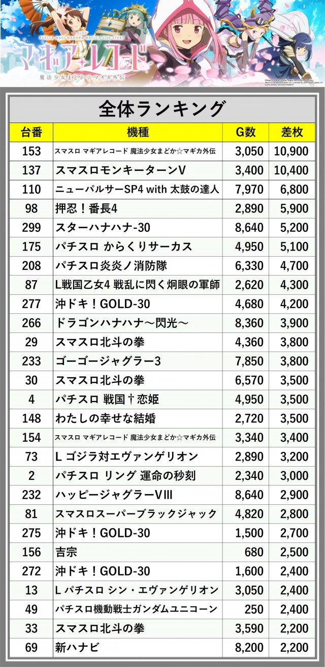 厳選された取材対象機種をはじめ、その他スロット全体から好記録が飛び出した!プレイヤーが楽しんだ1日を下記データにて振り返ってみて欲しい。