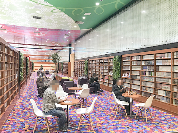 レストスペースには幅広いジャンルの漫画本が用意されており、取材時も満喫しているプレイヤーが多かった。