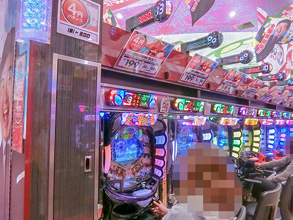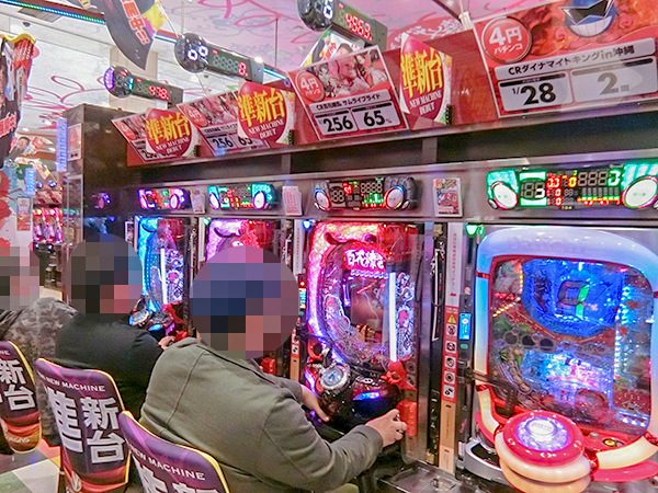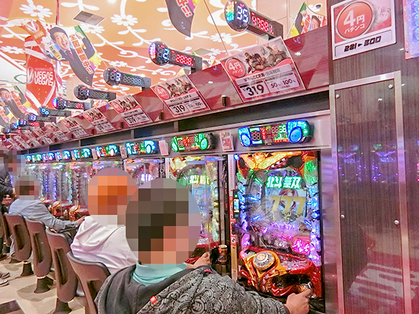 14時半ごろの4円パチンコをチェックすると、「ぱちんこCR真・北斗無双」や「CR百花繚乱 サムライブライド」、「ぱちんこCR真・北斗無双 第2章」で好調なプレイヤーが多数見受けられ、時折見せる嬉しそうな表情が印象に残っている。