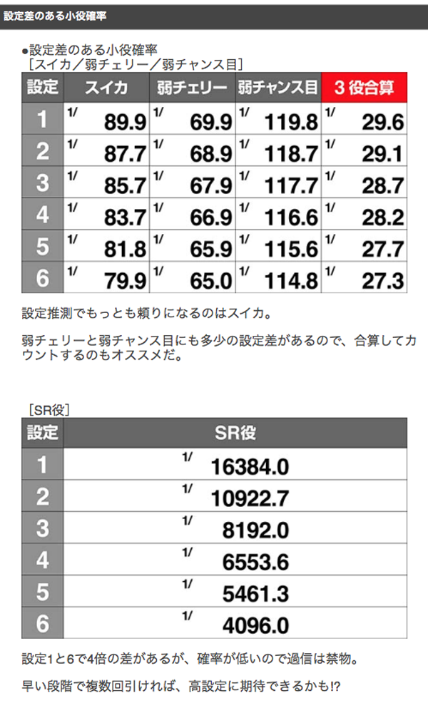 設定差のある小役確率のなかでは、スイカを要チェック。設定1と6で4倍の差があるSR役の確率にも注目だ。