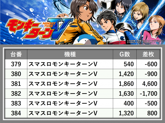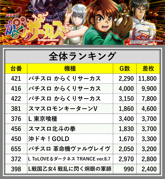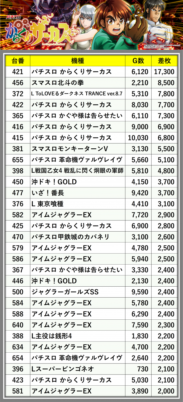厳選された取材対象機種をはじめ、その他スロット全体から好記録が飛び出した!プレイヤーが楽しんだ1日を下記データにて振り返ってみて欲しい。