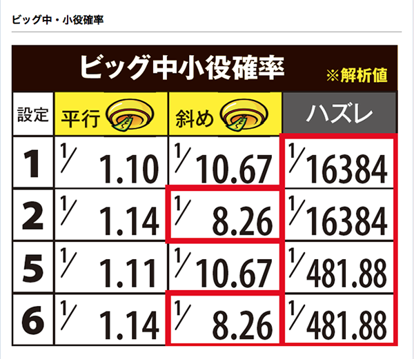 BIG中におけるハズレ確率の設定差は大きく、1度でも確認すれば高設定に期待できる。