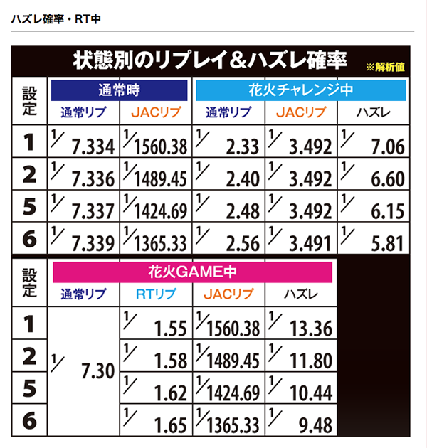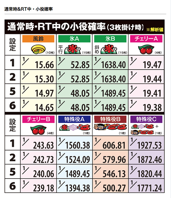 また、通常時の小役確率やRT中のハズレ確率にも注目しよう。