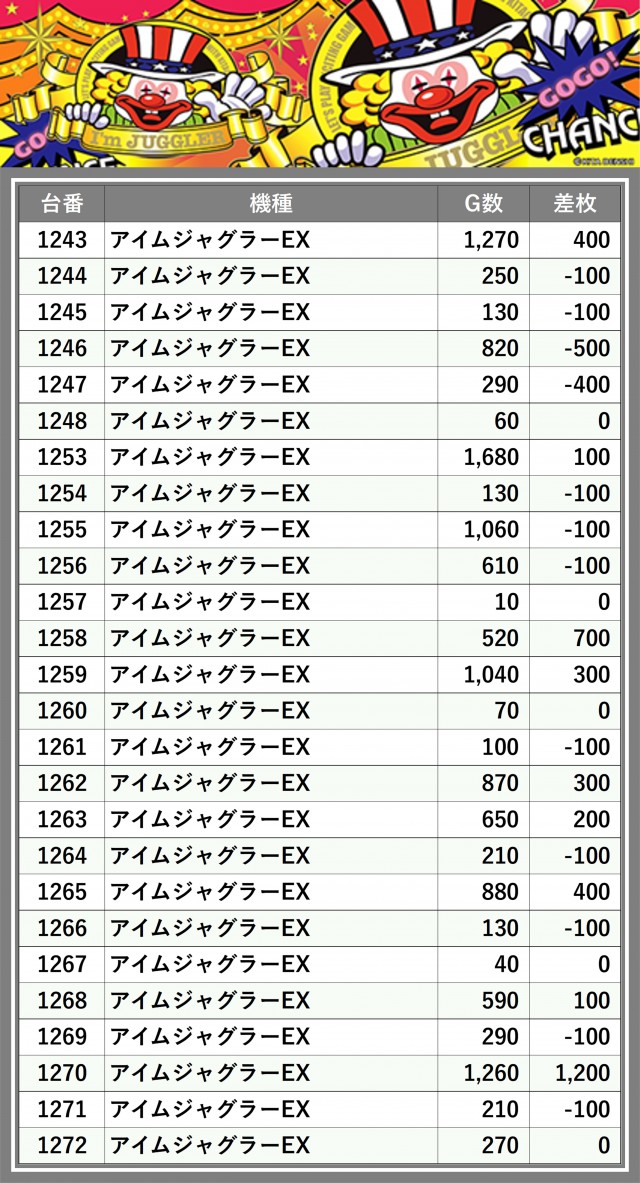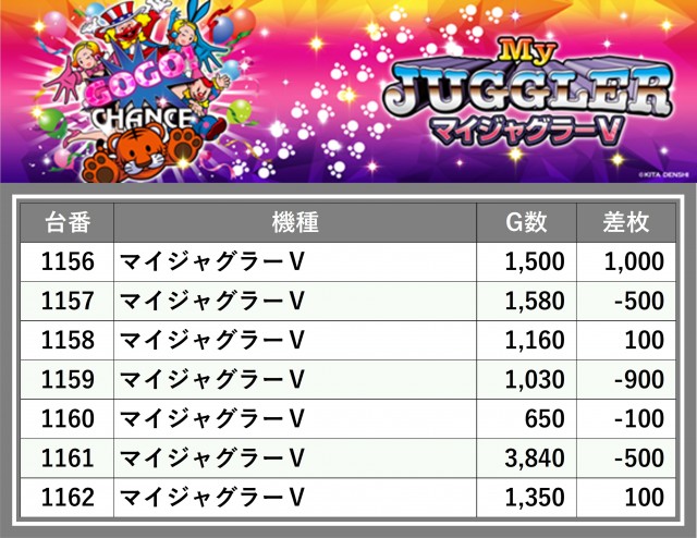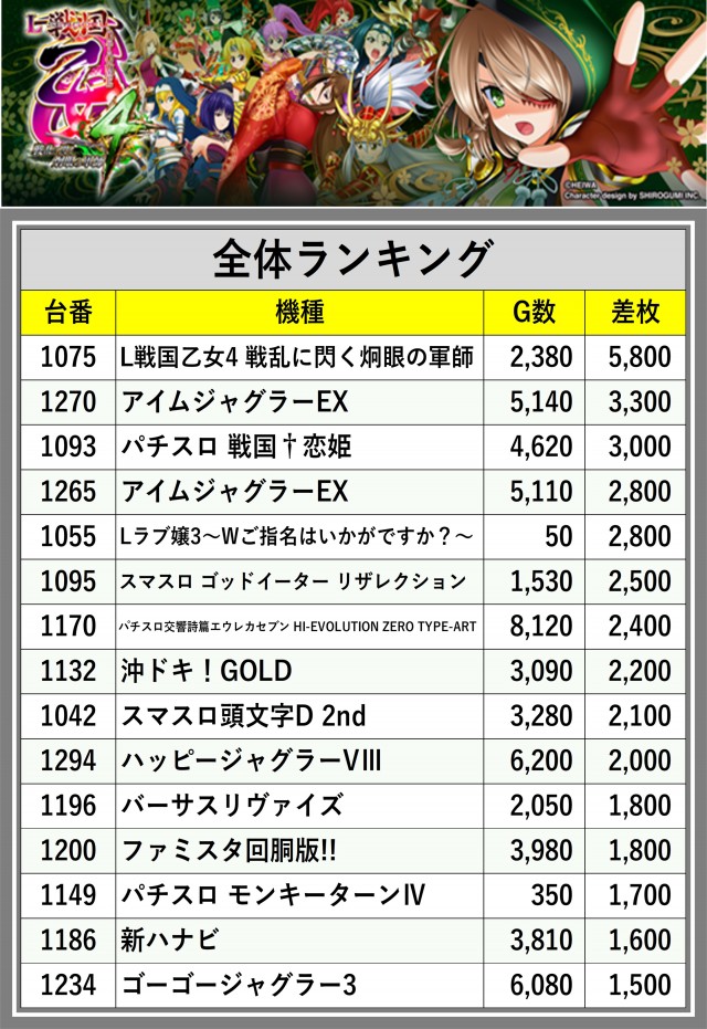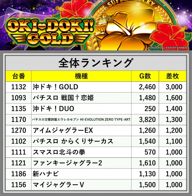 厳選された取材対象機種をはじめ、その他スロット全体から好記録が飛び出した!プレイヤーが楽しんだ1日を下記データにて振り返ってみて欲しい。