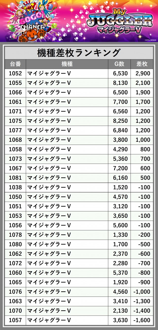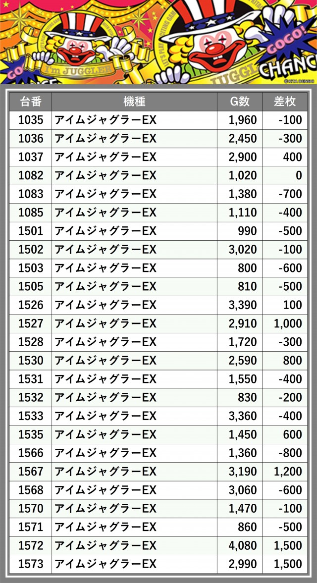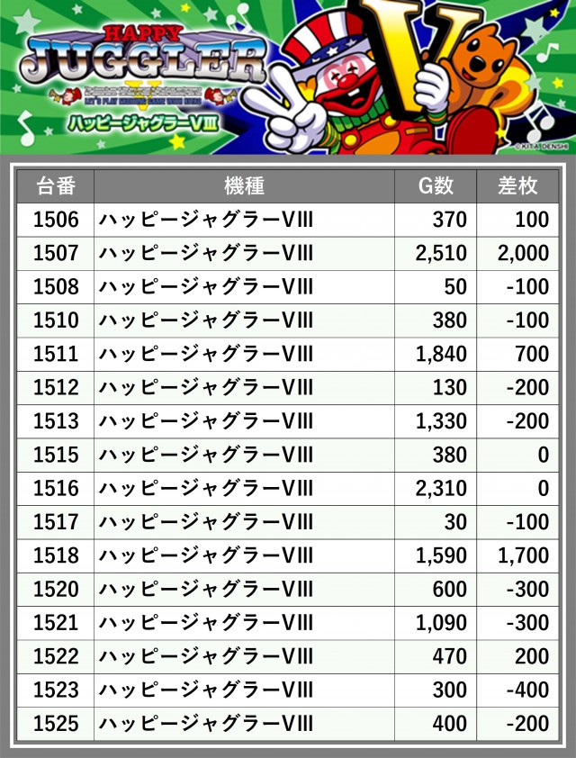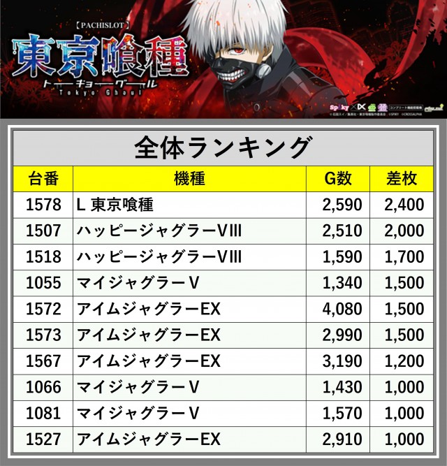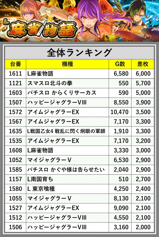 厳選された取材対象機種をはじめ、その他スロット全体から好記録が飛び出した!プレイヤーが楽しんだ1日を下記データにて振り返ってみて欲しい。