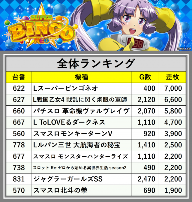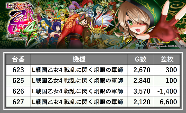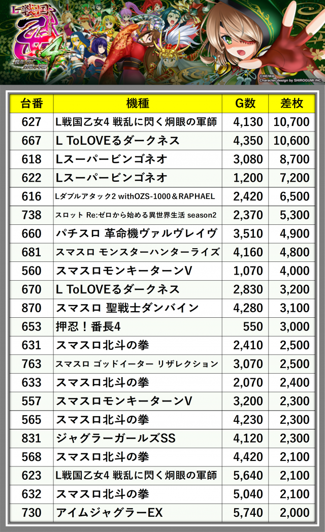 厳選された取材対象機種をはじめ、その他スロット全体から好記録が飛び出した!プレイヤーが楽しんだ1日を下記データにて振り返ってみて欲しい。