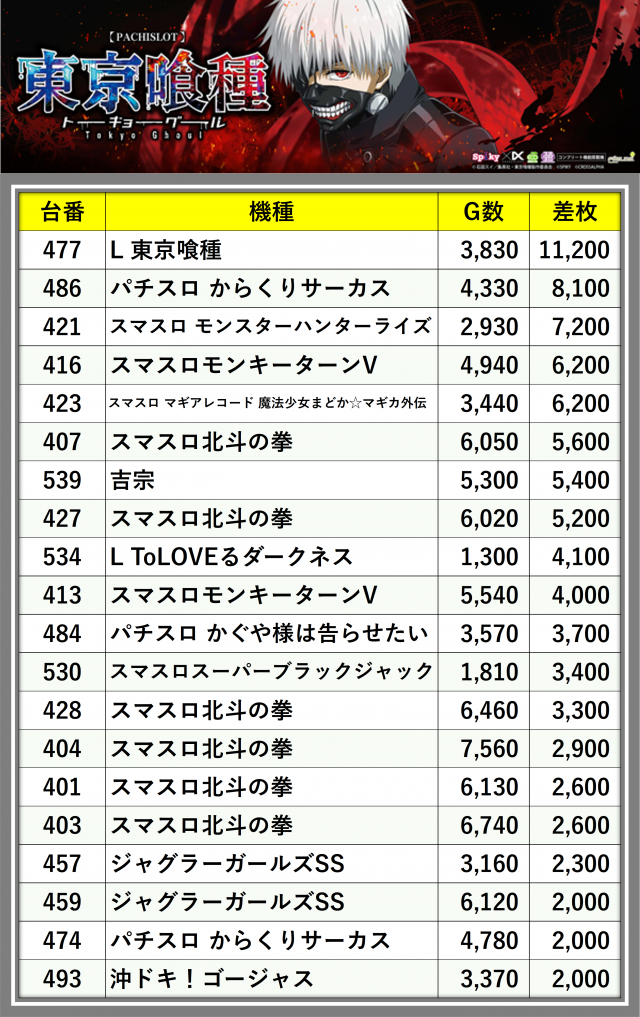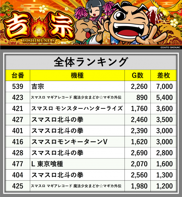 厳選された取材対象機種をはじめ、その他スロット全体から好記録が飛び出した!プレイヤーが楽しんだ1日を下記データにて振り返ってみて欲しい。