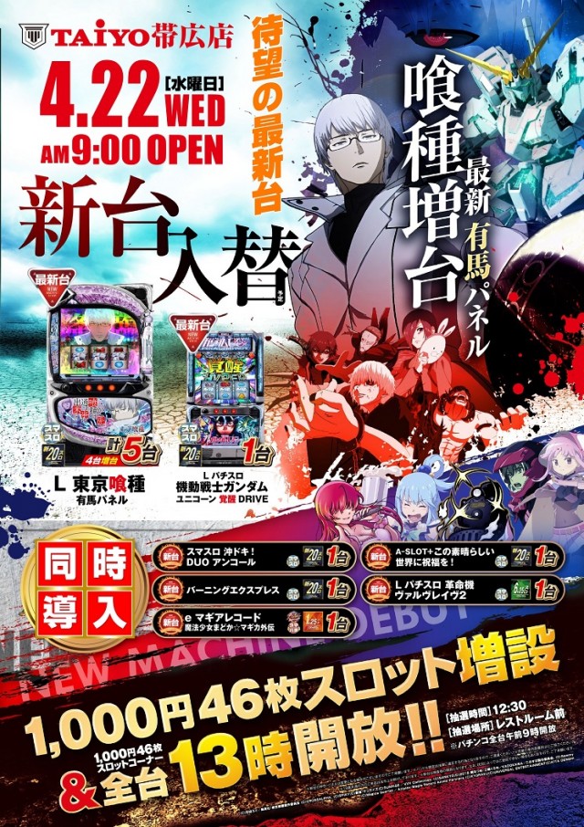 本日新台入替L東京喰種増台!46枚スロット全台13時差開放!