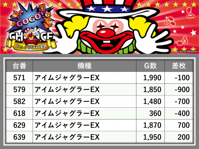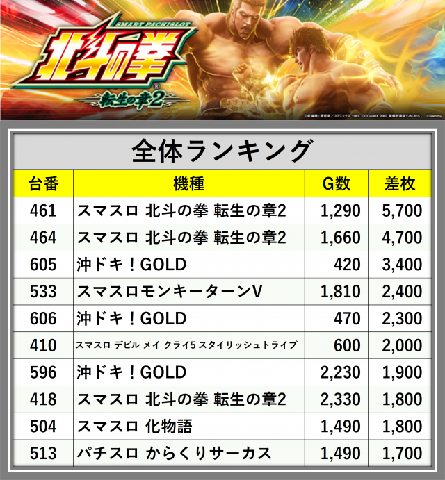 厳選された取材対象機種をはじめ、その他スロット全体から好記録が飛び出した!プレイヤーが楽しんだ1日を下記データにて振り返ってみて欲しい。