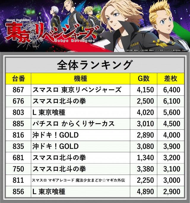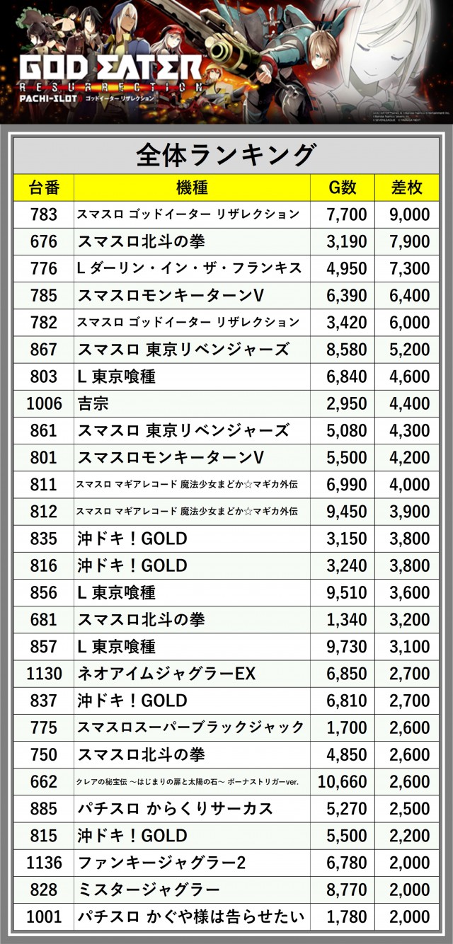 厳選された取材対象機種をはじめ、その他スロット全体から好記録が飛び出した!プレイヤーが楽しんだ1日を下記データにて振り返ってみて欲しい。