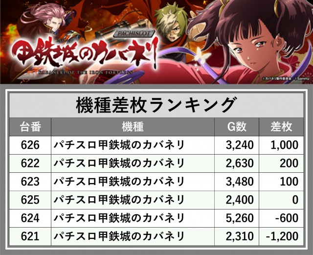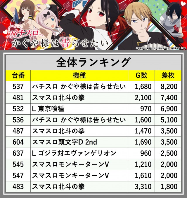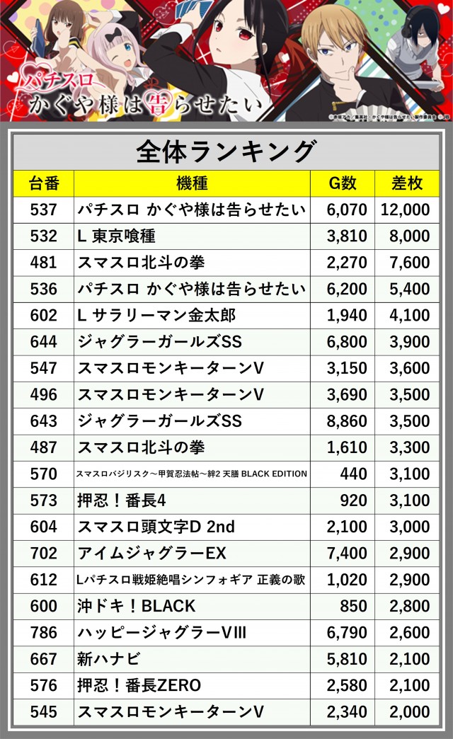 ※差枚数順に掲載しています