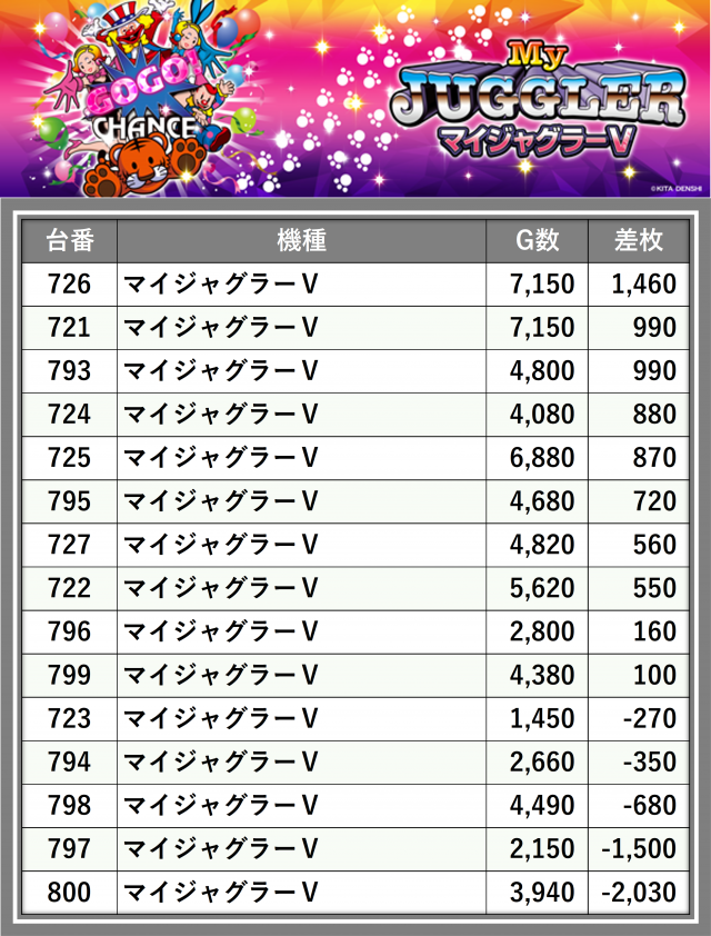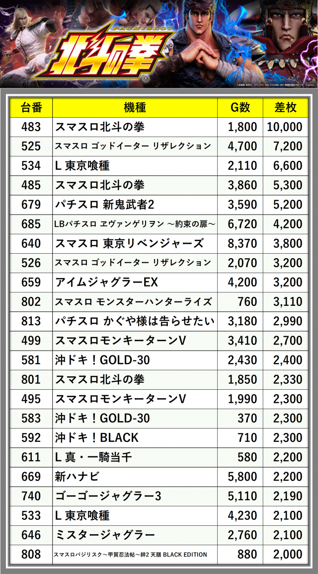 ※差枚数順に掲載しています