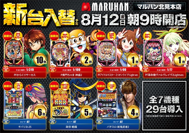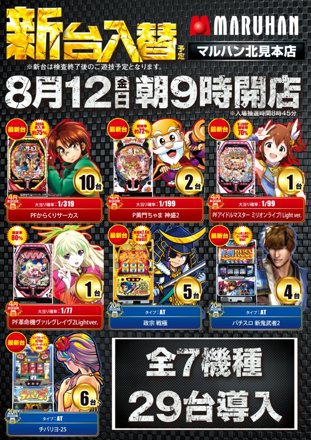 \8月12日(金) 新台入替×9時開店/7機種29台導入!