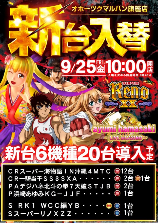 本日9月15日(火)新台入替×朝9時開店※入場抽選8時40分