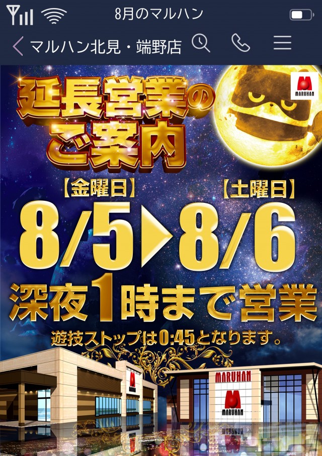 【マルハン北見店】8月6日(土)延長営業実施!週末マルハン!