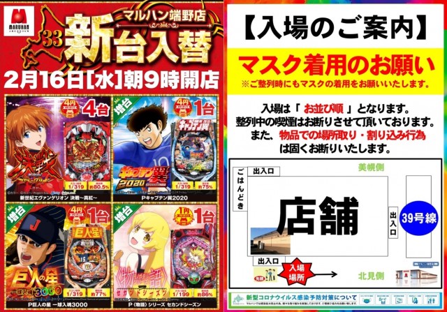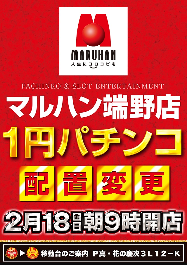 2月18日(金)朝9時から営業×1円パチンコ配置変更