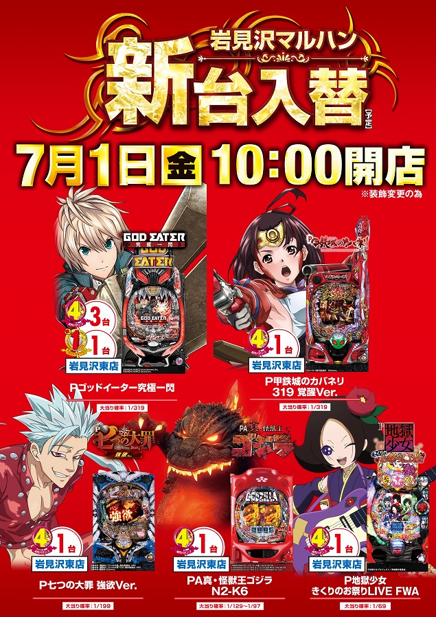 7月1日(金)10時開店! 新台入替 ※全店一斉装飾変更の為