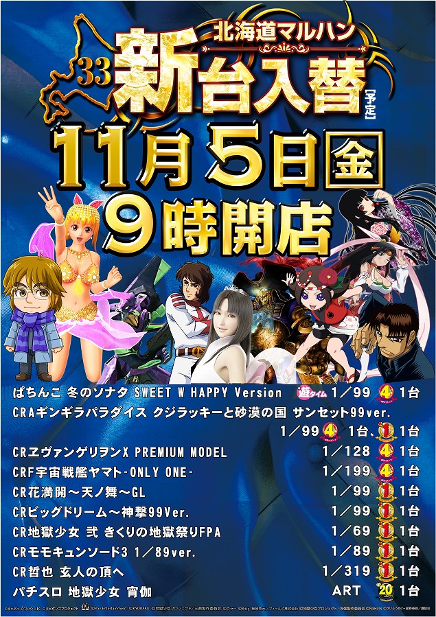 11月5日(金)朝9時開店【新台入替】10機種11台導入予定
