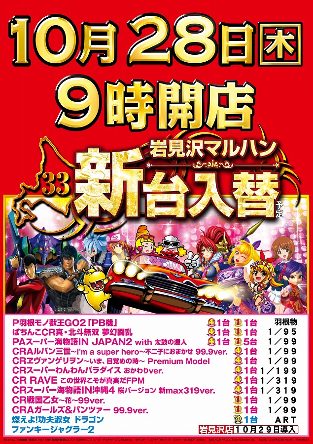 10月28日[木] 新台入替 朝9時開店!!