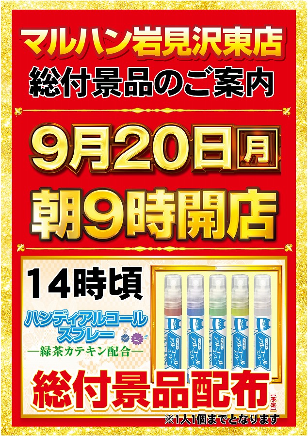 9月20日(月) 朝9時開店!総付景品配布予定!