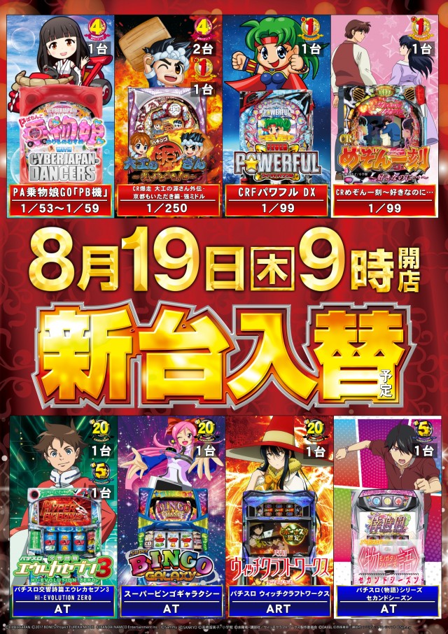 8月19日 [木] 新台入替 朝9時開店です!!