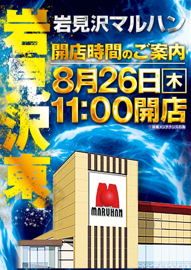 8月26日 [木] 11時開店!! ※設備メンテナンスの為