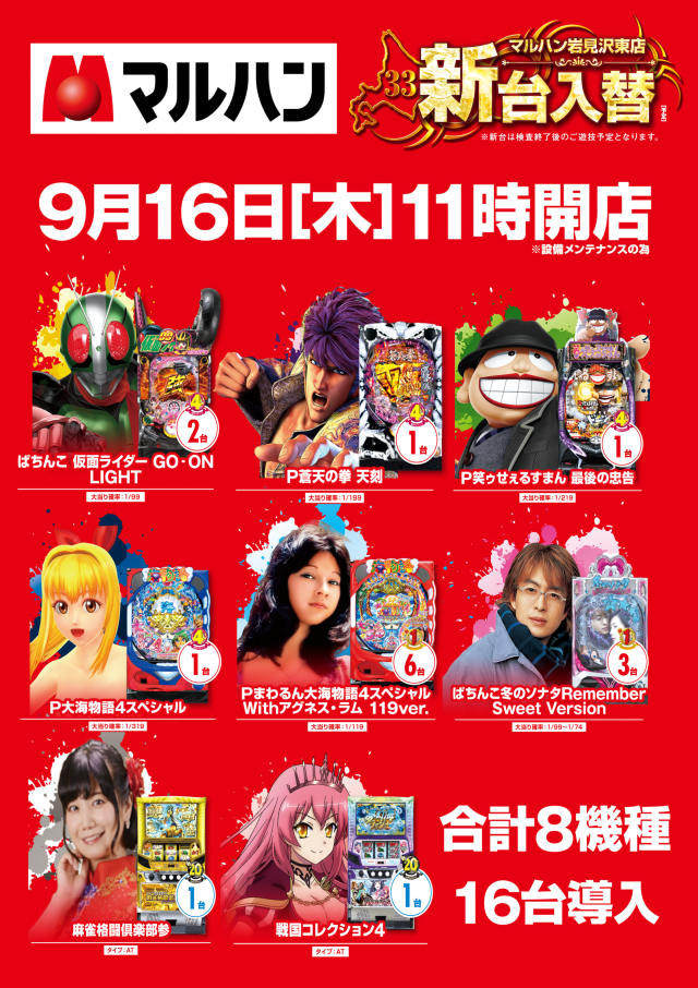 【岩見沢東店】9月16日(木) 昼11時開店!! 新台入替