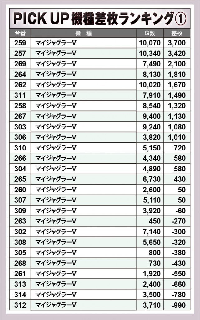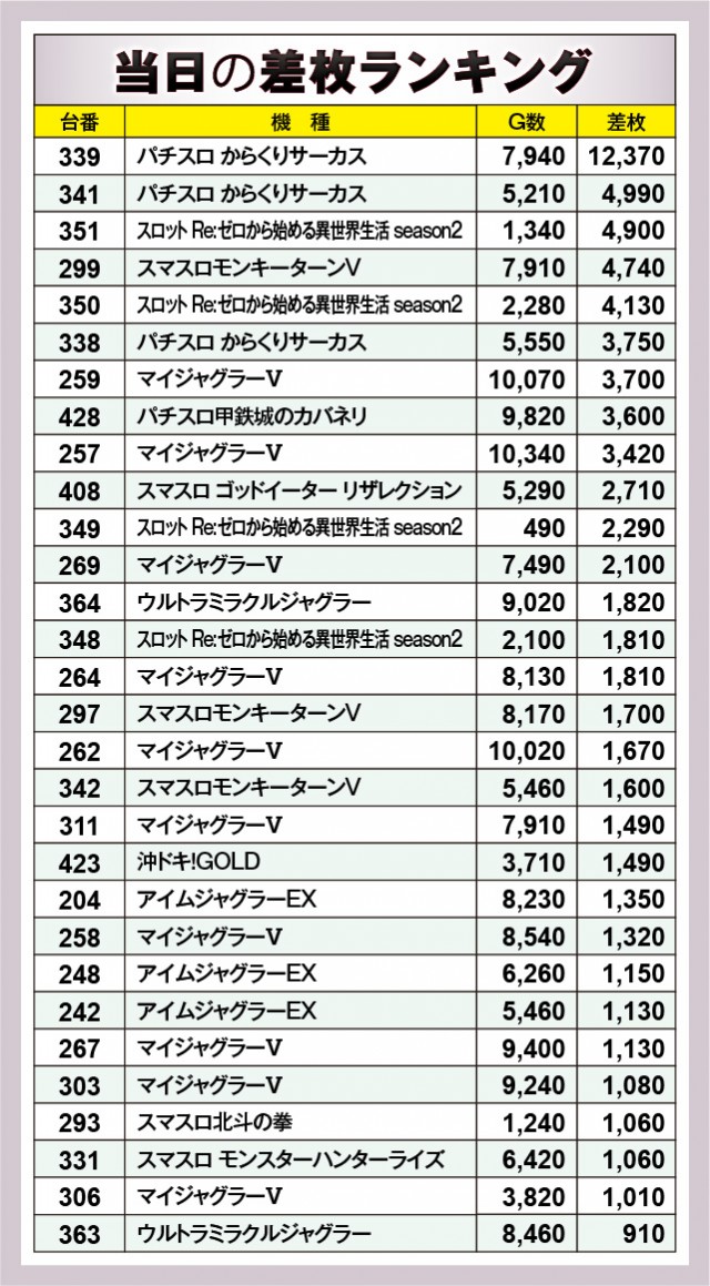 当日は『パチスロ からくりサーカス』にて万枚OVERが発生し、店内の熱気を大きくリードしていた。この他にもまとまった出玉を確保する台が見られるが、それ以上に目に留まるのが『マイジャグラーⅤ』の万回転OVERだろう。大きな手応えの証であるため、同店がこの日のために準備を整えていたのかが窺えるだけでなく、その事実に気付いたファン諸氏もあっぱれと言える。