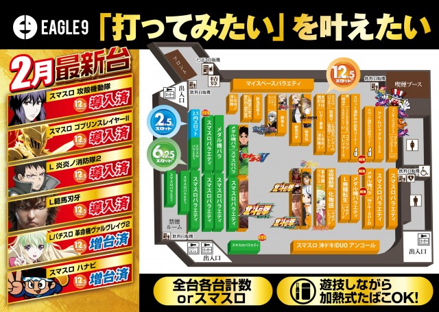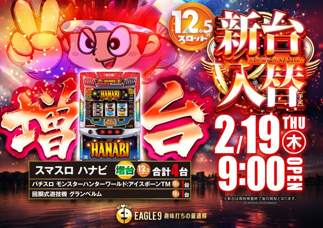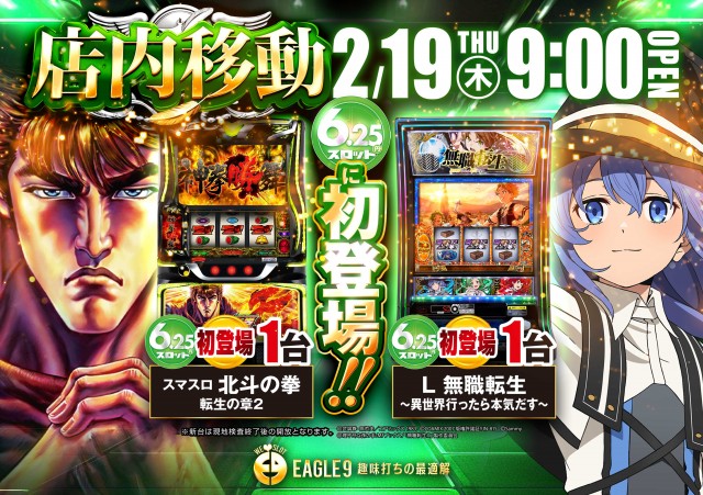 【イーグル9】2月19日朝9時開店!新台入替!店内移動!