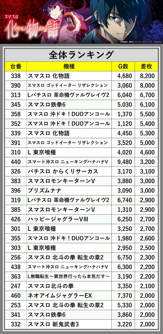 厳選された取材対象機種をはじめ、その他スロット全体から好記録が飛び出した!プレイヤーが楽しんだ1日を下記データにて振り返ってみて欲しい。
