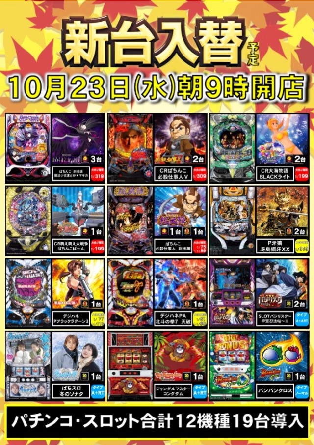 10月23日[水]新台入替!朝9時開店!