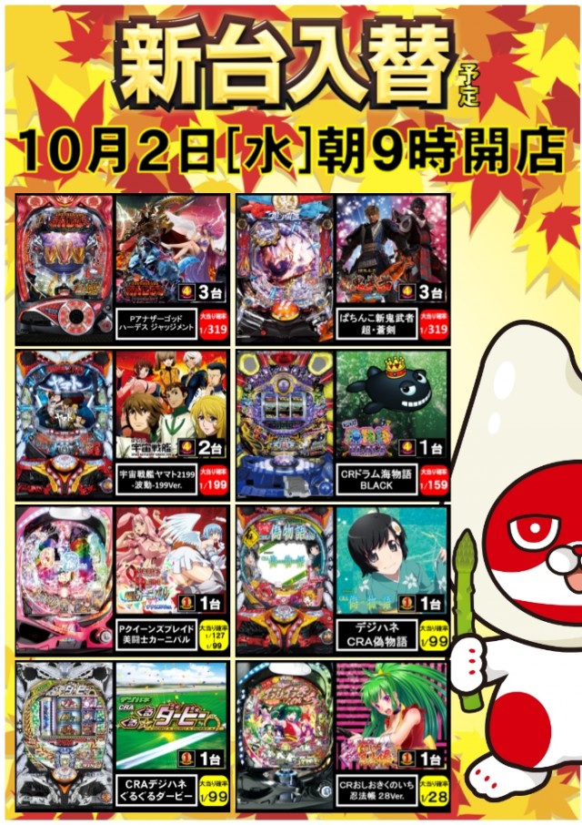 10月2日[水]新台入替!朝9時開店!