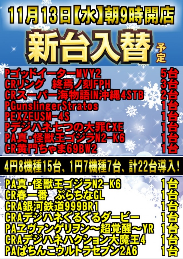 11月13日[水]新台入替!朝9時開店!