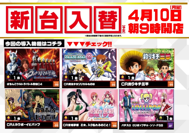 本日4月10日[月]★新台入替★(予定) 朝9時開店!!