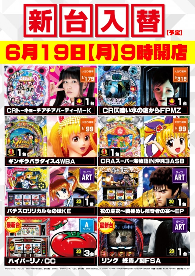 6月19日【月】 ★新台入替(予定)★ 朝9時開店♪