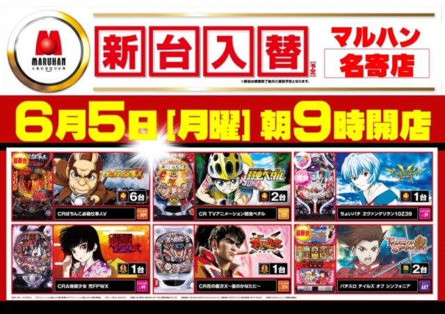 6月5日(月)本日、新台入替初日 朝9時より開店!!